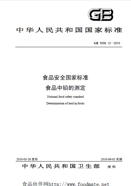GB 5009.12-2010 食品中铅的测定 英文版 已有译文已打五折