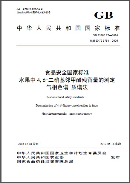 GB 23200.27-2016 水果中4,6-二硝基邻甲酚残留量的测定 气相色谱-质谱法 英文版 需联系翻译