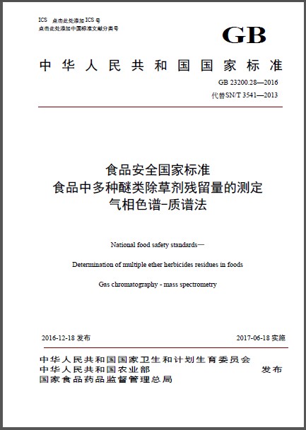 GB 23200.28-2016 食品中多种醚类除草剂残留量的测定 气相色谱-质谱法 英文版 需联系翻译