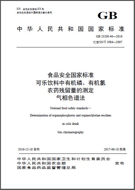 GB 23200.40-2016 可乐饮料中有机磷、有机氯农药残留量的测定 气相色谱法 英文版 需联系翻译