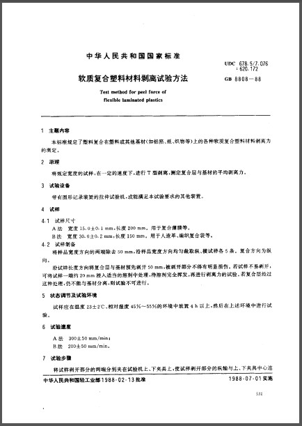 GB/T 8808-1988 软质复合塑料材料剥离试验方法 英文版 需联系翻译