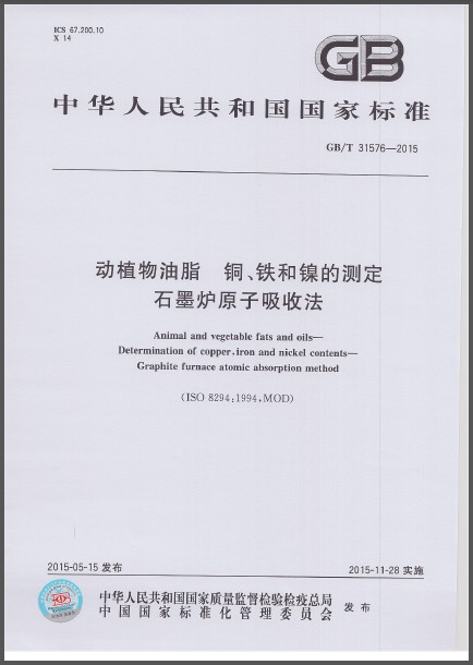 GB/T 31576-2015 动植物油脂 铜、铁和镍的测定 石墨炉原子吸收法 英文版 需联系翻译