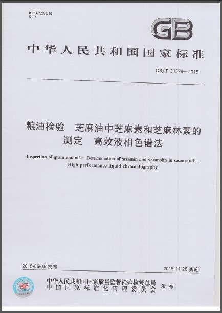 GB/T 31579-2015 粮油检验 芝麻油中芝麻素和芝麻林素的测定 高效液相色谱法 英文版需联系翻译