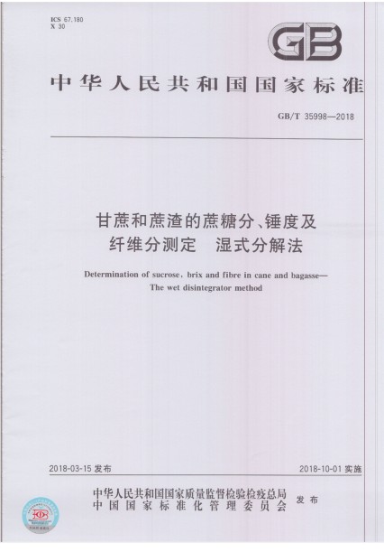 GB/T 35998-2018 甘蔗和蔗渣的蔗糖分、锤度及纤维分测定 湿式分解法 英文版 需联系翻译